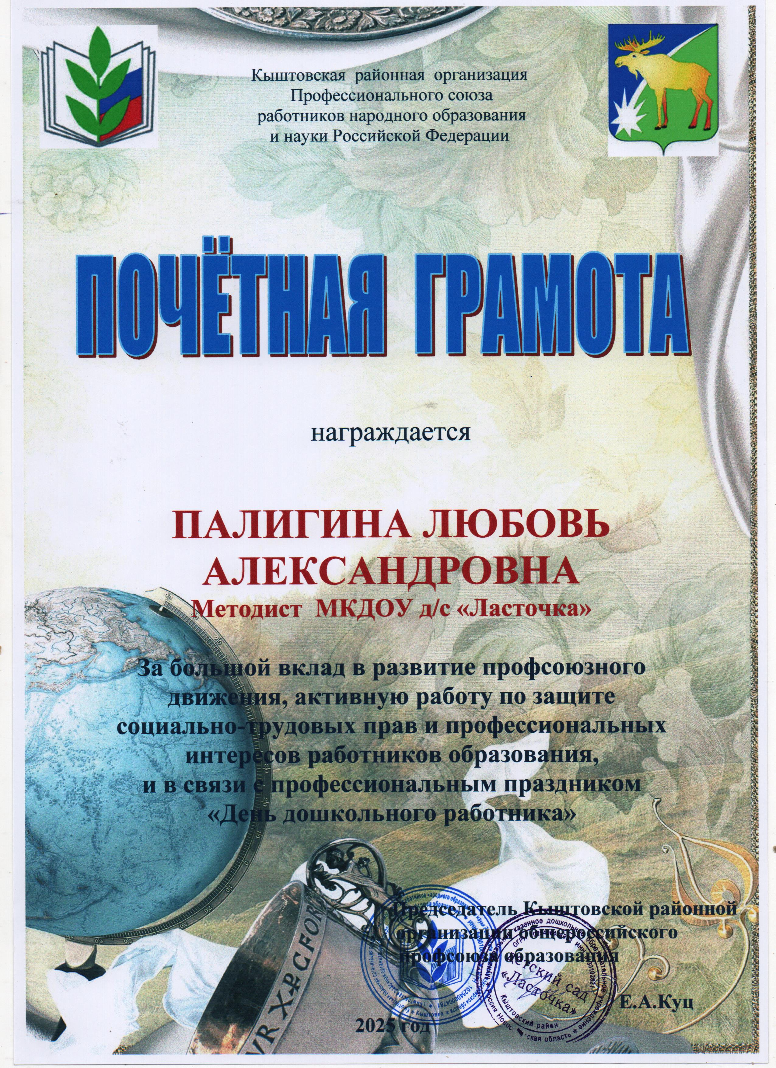Почётная грамота Кыштовская районная организация Профессионального союза работников народного образования и науки Российской Федерации