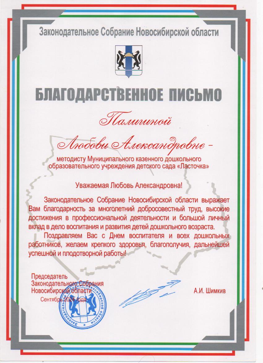 Благодарственное письмо Законодательное Собрание Новосибирской области